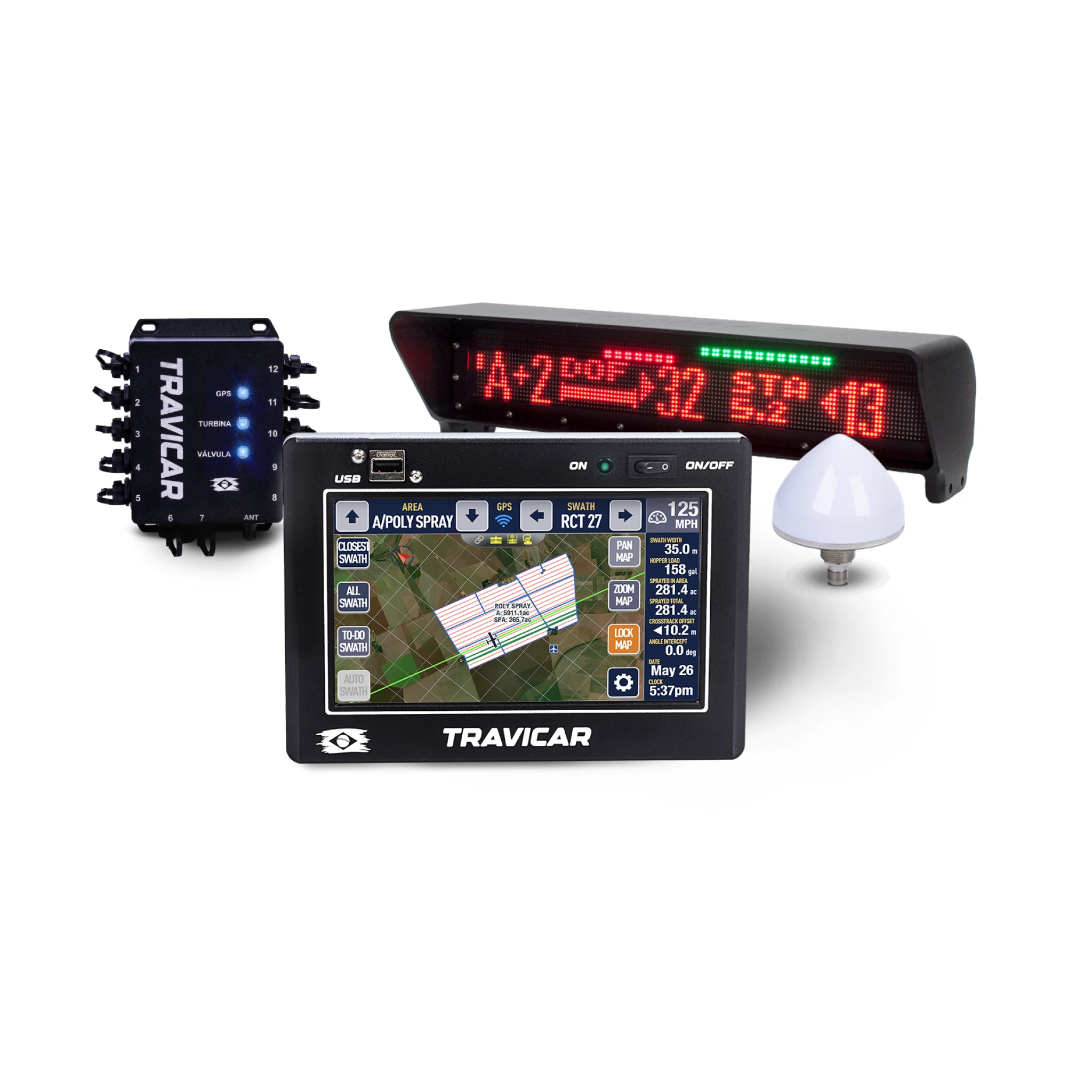 Flow meter, laser altimeter, on/off valve, and mobile weather station form a complete ecosystem that, combined with Travicar Connect, ensures full management, reduces waste, and increases the precision of aerial applications in the field.